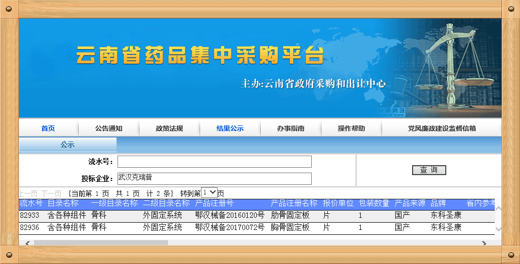 (武漢克瑞普骨科耗材在云南省藥品集中采購項(xiàng)目成功掛網(wǎng)產(chǎn)品展示截圖)