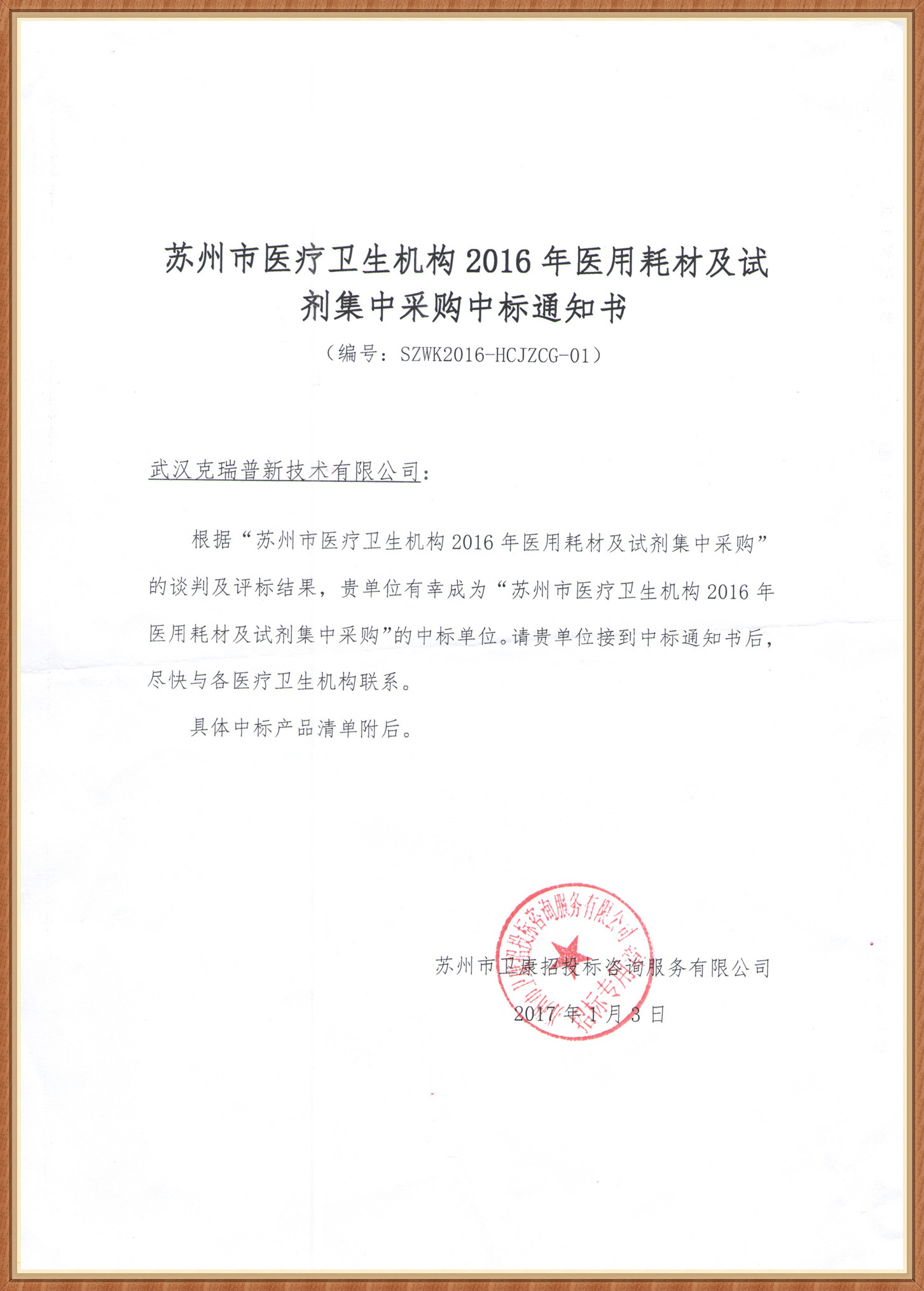 【江蘇省蘇州市醫(yī)療衛(wèi)生機(jī)構(gòu)2016年醫(yī)用耗材及試劑集中采購中標(biāo)通知書】我們武漢克瑞普新技術(shù)有限公司很有幸的在蘇州市醫(yī)療衛(wèi)生機(jī)構(gòu)2016年醫(yī)用耗材及試劑集中采購招標(biāo)中我們成功中標(biāo)了,那么我們這次中標(biāo)的產(chǎn)品有胸部護(hù)板、指骨板、膝關(guān)節(jié)固定套、肩肘固定帶、前臂支具、下肢支具及頸椎矯形器等骨科耗材產(chǎn)品,我們的產(chǎn)品種類較為多樣歡迎各大經(jīng)銷商與我們聯(lián)系。