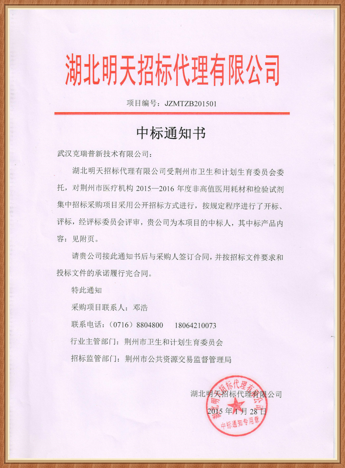 【湖北省荊州市2015-2016年度非高值醫(yī)用耗材和檢驗試劑集中招標(biāo)采購中標(biāo)通知書】武漢克瑞普新技術(shù)有限公司在荊州市醫(yī)療機(jī)構(gòu)非高值醫(yī)用耗材和檢驗試劑集中招標(biāo)采購項目中我司經(jīng)評標(biāo)委員會的評審決定成功獲得了中標(biāo)的資格,我們本次中標(biāo)的產(chǎn)品是我廠家較為關(guān)注的一款產(chǎn)品那就是我們的東科圣康品牌的胸腔固定夾板產(chǎn)品,這款產(chǎn)品在醫(yī)院以臨床使用中較為良好,我們歡迎各大經(jīng)銷商與我們?nèi)〉煤献鳌?/span>