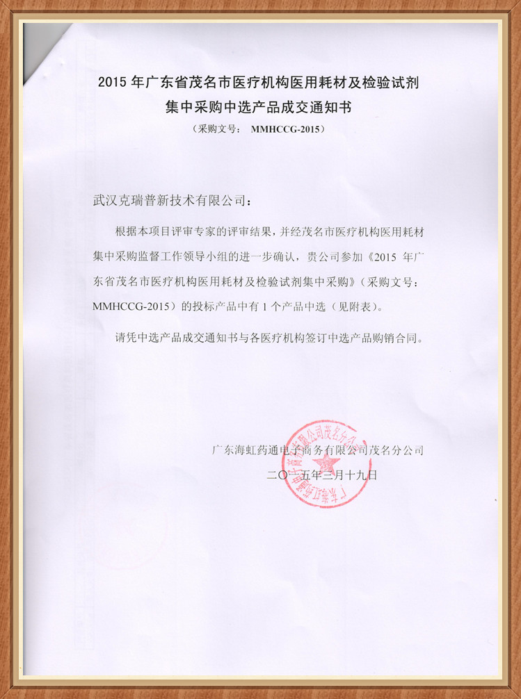 【2015年廣東省茂名市醫(yī)療機構(gòu)醫(yī)用耗材及檢驗試劑集中采購中選產(chǎn)品成交通知書】我們武漢克瑞普公司生產(chǎn)的胸腔固定夾板產(chǎn)品在茂名市醫(yī)用耗材集中采購?fù)稑酥谐晒Φ某蔀榱酥袠水a(chǎn)品,我們的胸腔固定夾板已在各大醫(yī)院臨床使用,使用反應(yīng)良好值得推薦。