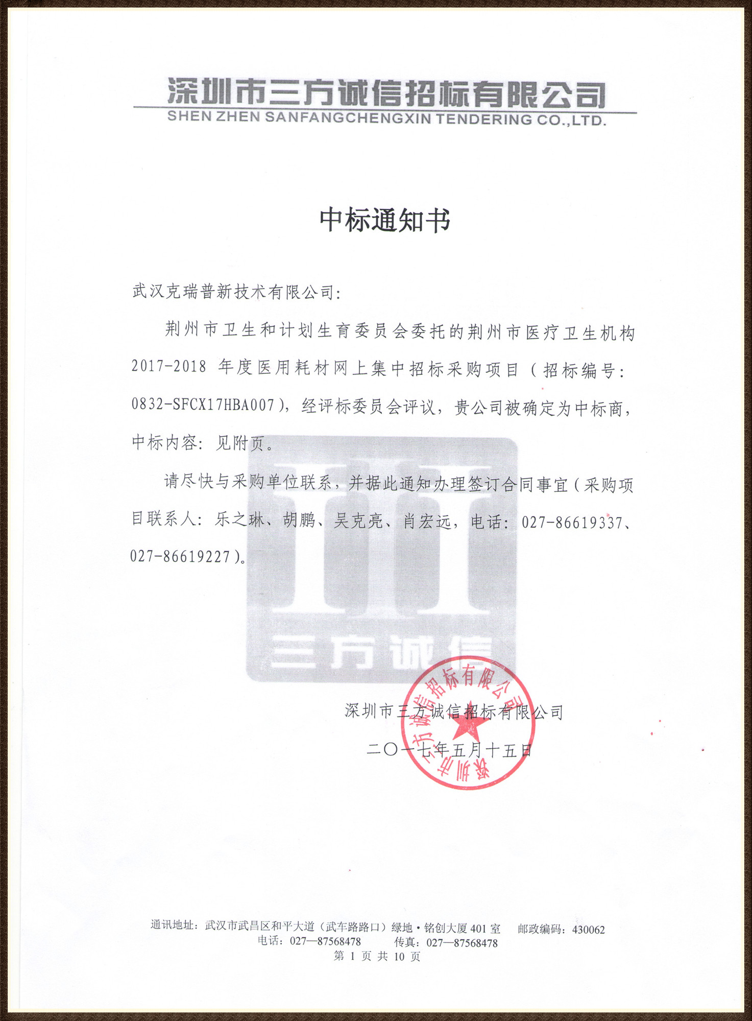 【湖北省荊州市衛(wèi)生機(jī)構(gòu)2017-2018年度醫(yī)用耗材網(wǎng)上集中招標(biāo)采購項(xiàng)目中標(biāo)通知書】武漢克瑞普在2017-2018年度荊州市醫(yī)用耗材集中招標(biāo)采購項(xiàng)目中成功中標(biāo)了以下骨科耗材產(chǎn)品具體有:胸腔固定夾板、高分子固定繃帶、高分子固定夾板、醫(yī)用固定帶(種類包含多樣)、醫(yī)用外固定支具等骨科耗材在評(píng)標(biāo)委員會(huì)的評(píng)判下我司被確定為中標(biāo)商。