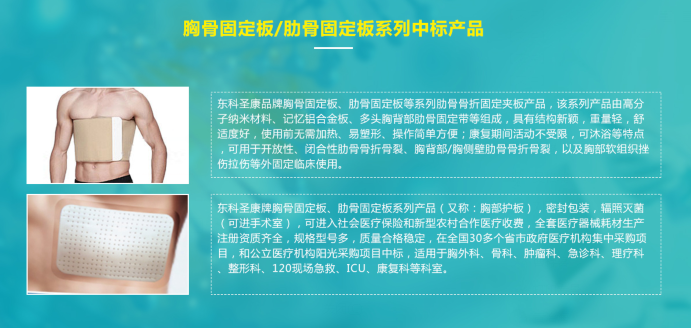 東科圣康牌胸骨固定板、肋骨固定板系列產(chǎn)品(又稱:胸部護(hù)板),密封包裝,輻照滅菌(可進(jìn)手術(shù)室),可進(jìn)入社會醫(yī)療保險和新型農(nóng)村合作醫(yī)療收費(fèi),全套醫(yī)療器械耗材生產(chǎn)注冊資質(zhì)齊全,規(guī)格型號多,質(zhì)量合格穩(wěn)定,在全國30多個省市政府醫(yī)療機(jī)構(gòu)集中采購項目,和公立醫(yī)療機(jī)構(gòu)陽光采購項目中標(biāo),適用于胸外科、骨科、腫瘤科、急診科、理療科、整形科、120現(xiàn)場急救、ICU、康復(fù)科等科室。