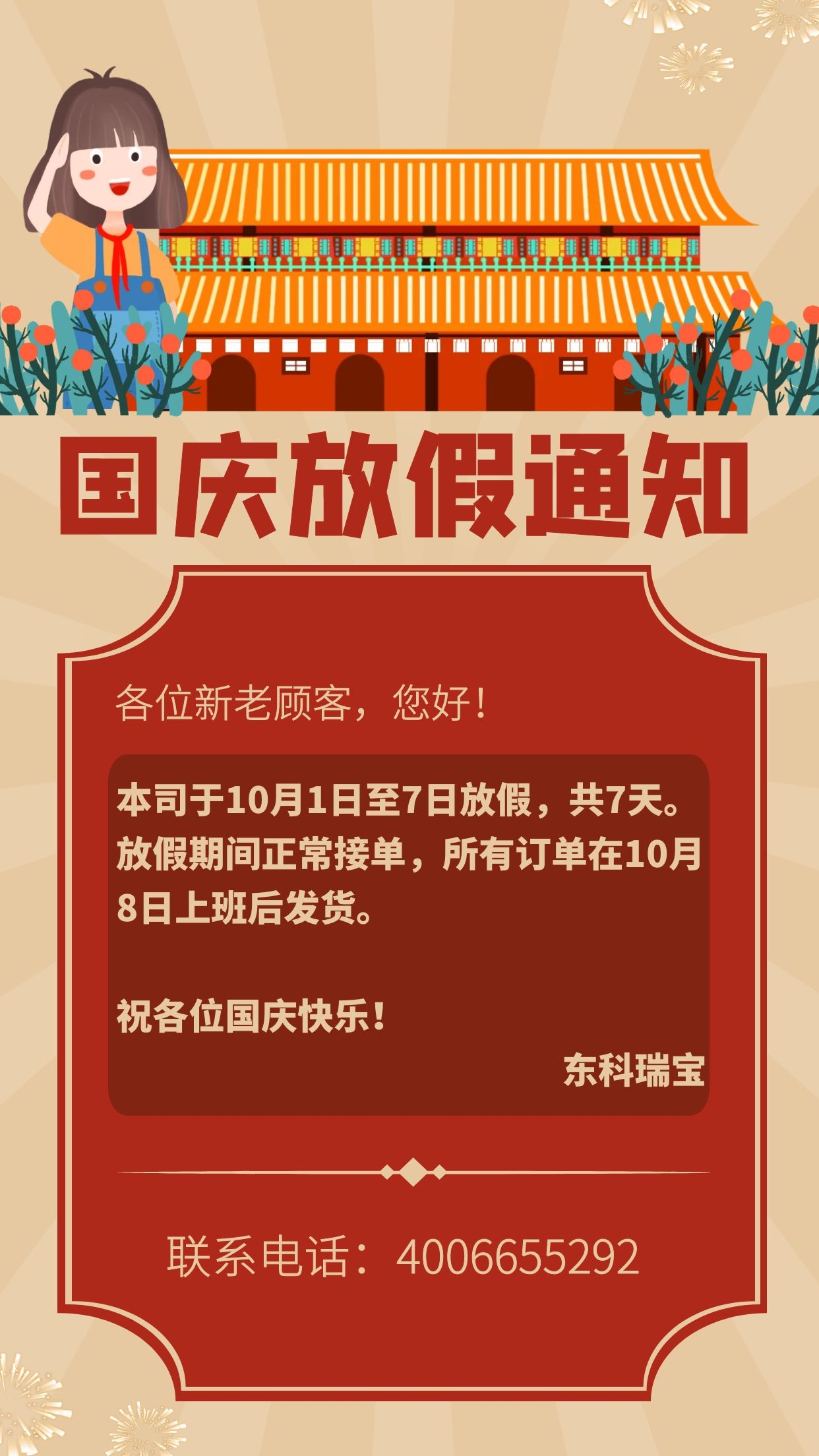 各位新老客戶(hù),您好! 本司于10月1日至7日放假,共7天。放假期間正常接單,所有訂單在10月8日上班后發(fā)貨。 祝各位國(guó)慶快樂(lè)! 東科瑞寶 ????