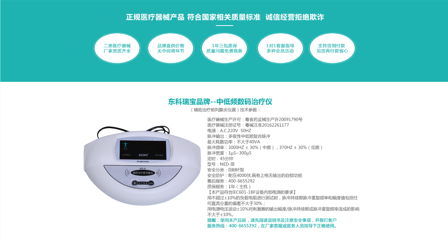 該治療儀器使用220v交流電源,符合國家YY0505標準電磁兼容有關要求,具有耐壓4000伏和上電無輸出自鎖的安防功能,可適用于家庭、中小醫(yī)療機構(gòu)、鄉(xiāng)鎮(zhèn)醫(yī)院、社區(qū)診所理療科室等,品牌廠家為每位用戶建立服務檔案,專職客服提供一對一跟蹤指導服務,解決用戶使用中的各種疑難問題,咨詢服務電話:400-6655-292,東科瑞寶品牌系列產(chǎn)品全國尋求合作伙伴,批零兼營,東科瑞寶專心誠意為您服務!