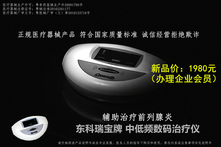 前列腺治療儀哪款好?專業(yè)人士提醒購買理療康復(fù)產(chǎn)品,還是請選擇正規(guī)器械生產(chǎn)廠家、資質(zhì)齊全的產(chǎn)品為妥。(2019新款上市)東科瑞寶牌前列腺儀器產(chǎn)品(輔助治療前列腺炎專用中低頻數(shù)碼治療儀)新品上市,銷售價(jià):1980元/套(辦理企業(yè)會(huì)員,享受會(huì)員服務(wù)與權(quán)益),該家用型治療儀器為二類準(zhǔn)字醫(yī)療器械產(chǎn)品,采用多級性中低頻復(fù)合脈沖,符合國家YY0505標(biāo)準(zhǔn)電磁兼容有關(guān)要求,該治療儀器使用220v交流電源,具有耐壓4000伏和上電無輸出自鎖的安防功能, 廠家一年三包質(zhì)保售后,可適用于家庭、中小醫(yī)療機(jī)構(gòu)、鄉(xiāng)鎮(zhèn)醫(yī)院、社區(qū)診所理療科室等。