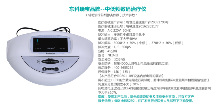 我們的家用小型前列腺治療儀--(2019新款)東科瑞寶牌前列腺治療儀器(輔助治療前列腺炎專用中低頻數(shù)碼治療儀),為國標(biāo)二類醫(yī)療器械產(chǎn)品,由治療儀主機、導(dǎo)電理療電極片、DC導(dǎo)線、前列腺儀器設(shè)備專用固定帶等配件耗材組成。