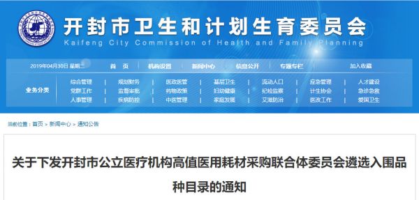 4月30,開封市衛(wèi)健委發(fā)布《關(guān)于下發(fā)開封市公立醫(yī)療機構(gòu)高值醫(yī)用耗材采購聯(lián)合體委員會遴選入圍品種目錄的通知》(以下簡稱《通知》)。