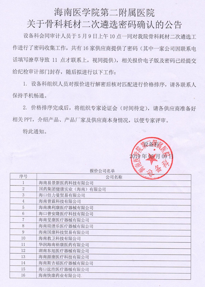 海南醫(yī)學(xué)院第二附屬醫(yī)院設(shè)備科會(huì)同審計(jì)人員于5月9日上午10點(diǎn),一同對(duì)我院骨科耗材二次遴選工作進(jìn)行了密碼收集工作,共有16家供應(yīng)商提供了密碼(其中一家公司因聯(lián)系電話填寫潦草導(dǎo)致11點(diǎn)才聯(lián)系上,視同提供),相關(guān)報(bào)價(jià)電子版及密碼己經(jīng)提交給紀(jì)檢審計(jì)部門封存,隨后擬進(jìn)行以下工作: