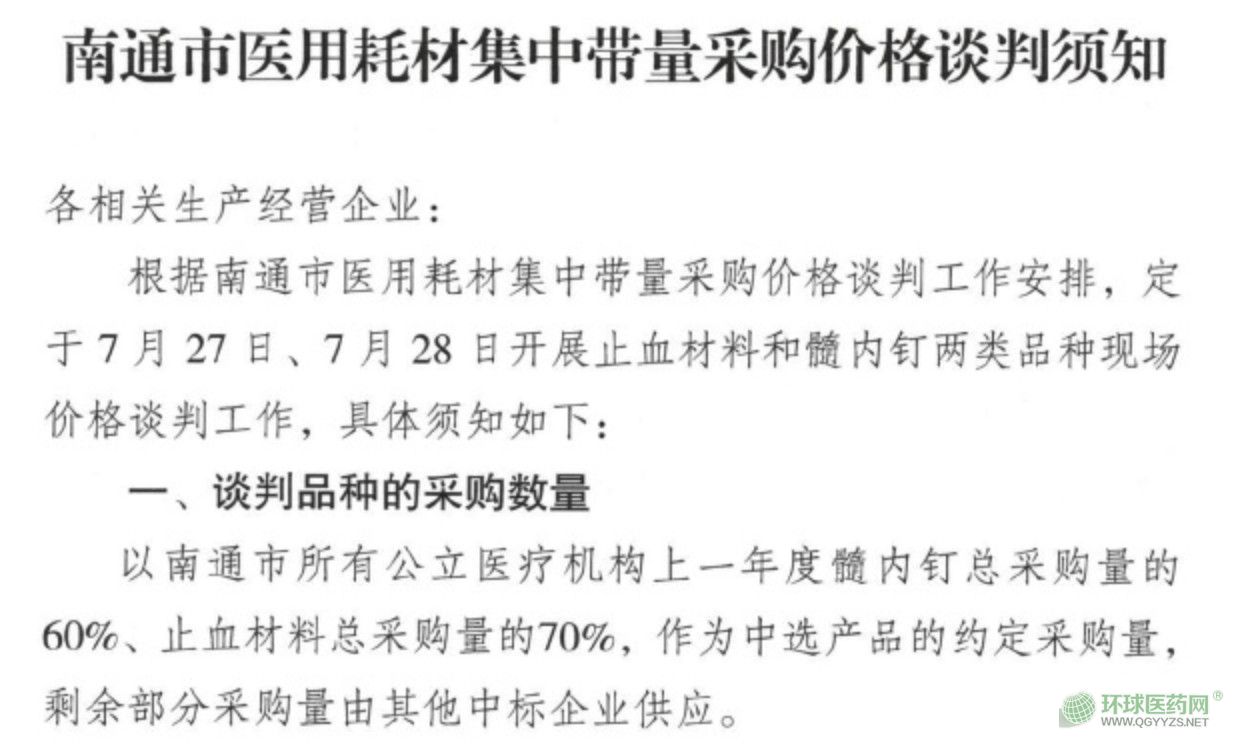 根據南通市的“價格談判須知”,約定髓內釘的采購量為2018年度全市醫(yī)院總采購量的60%,止血材料的采購量為2018年度總采購量的70%,剩余部分采購量由其他中標企業(yè)供應。