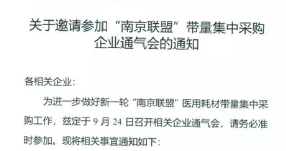 近日,一份《關(guān)于邀請(qǐng)參加“南京聯(lián)盟”帶量集中采購(gòu)企業(yè)通氣會(huì)的通知》在業(yè)內(nèi)流傳,顯示為進(jìn)一步做好新一輪南京聯(lián)盟醫(yī)用耗材帶量集中采購(gòu)工作,茲定于9月24日召開企業(yè)通氣會(huì)。